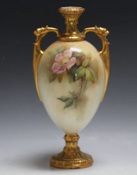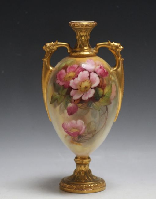 A ROYAL WORCESTER ROSES TWIN HANDLED VASE, signed Sedgley, H 24 cm