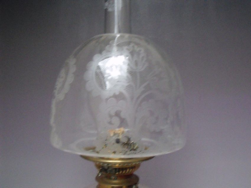 A 19TH CENTURY BRASS AND GLASS OIL LAMP, with circular and bulbous support leading to a cleat glass reservoir, etched glass shade, plain chimney, overall H 62 cm