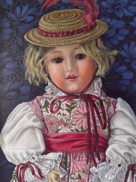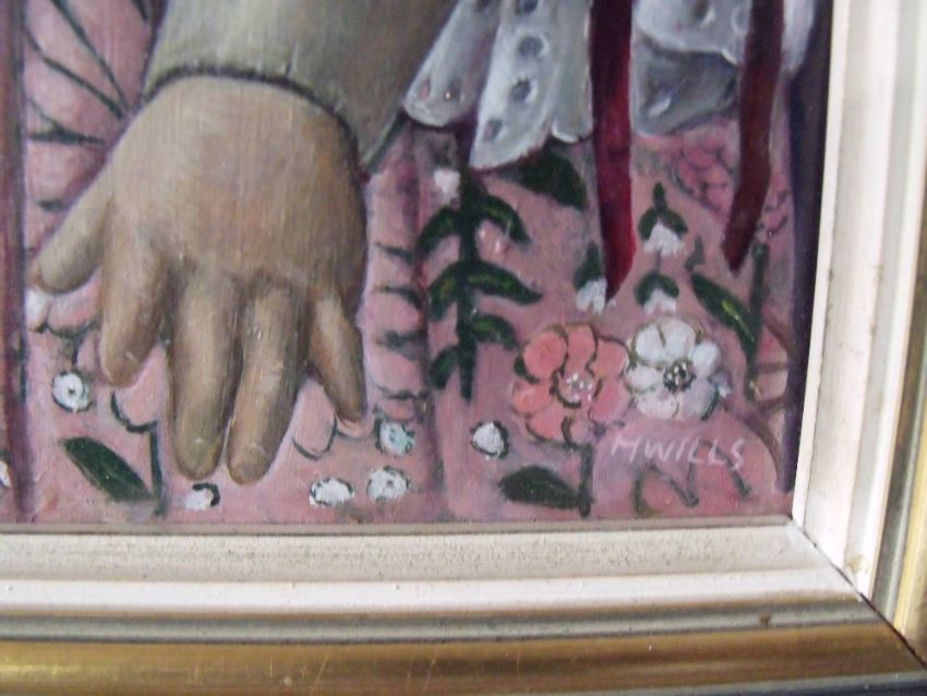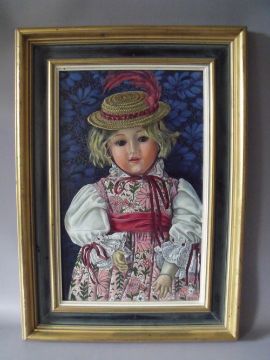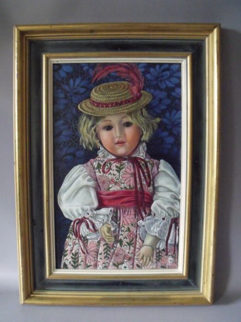 MINNIE WILLS (XX). Study of a child's doll with straw hat, with a decorative background, 'Cynthia' see verso, signed lower right, oil on board, framed, 39 x 23 cm