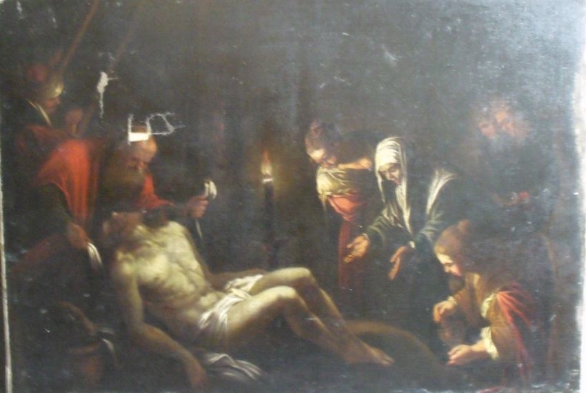 (XVIII). School of BASSANO 'The Descent From The Cross', with worshipers, unsigned, oil on canvas, unframed, 84 x 121 cm
