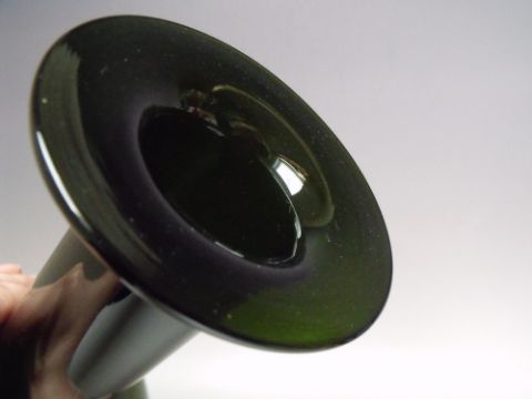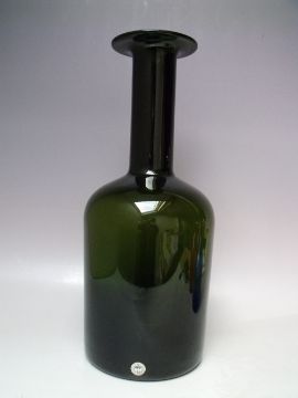OTTO BRAUER - KASTRUP HOLMEGAARD GULVVASE ( GUL VASE) - A GREEN DANISH STUDIO / ART GLASS BOTTLE VASE, having long neck and wide rim, original label to bottom edge, H 37 cm