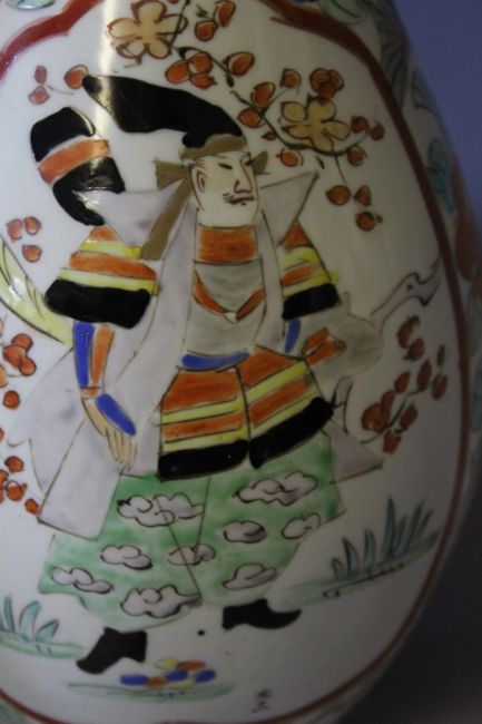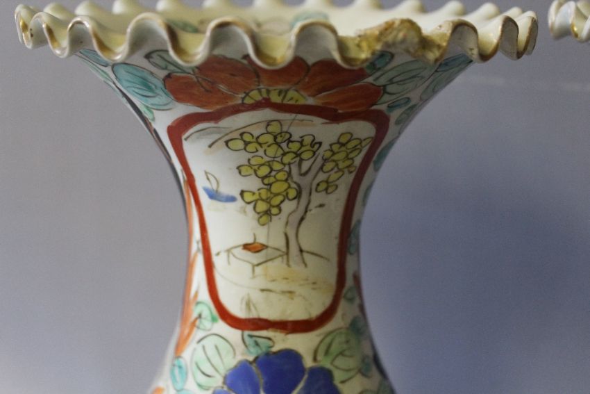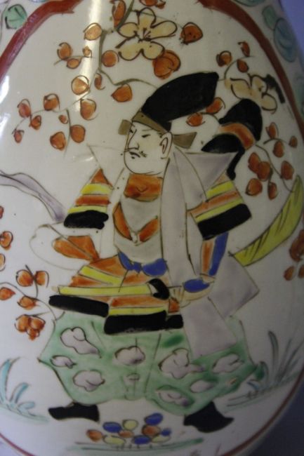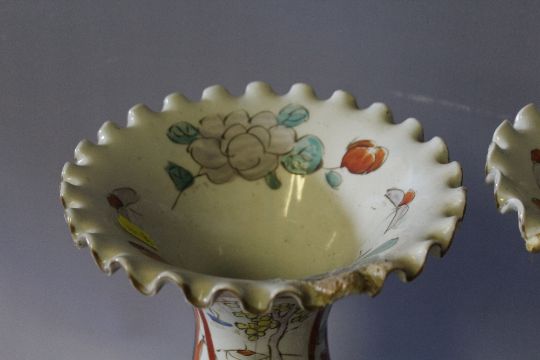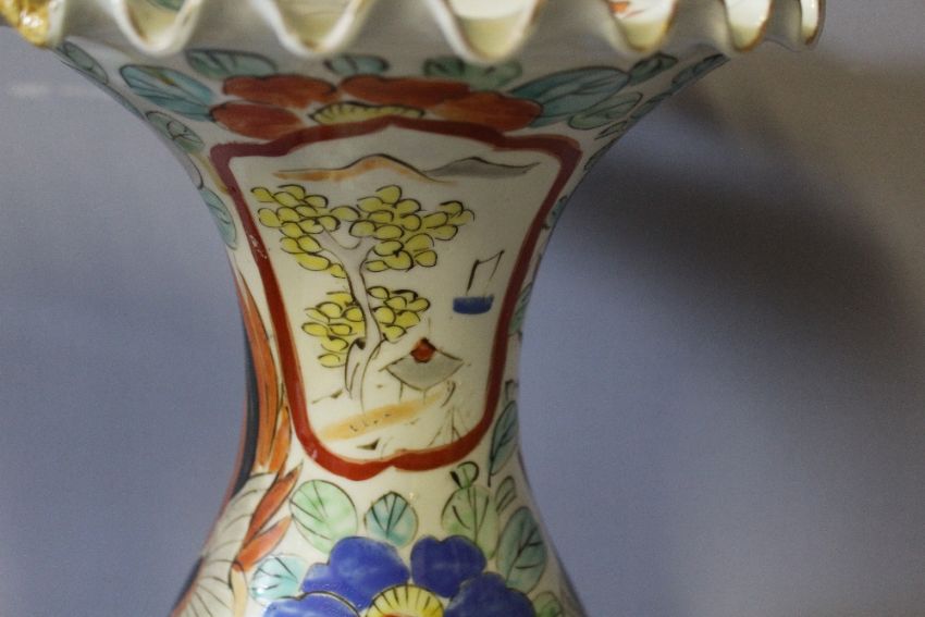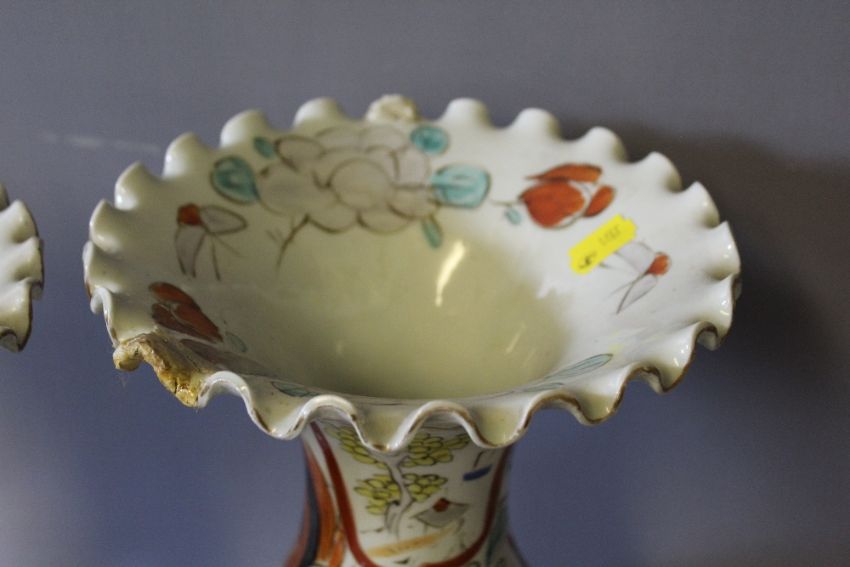 A PAIR OF ORIENTAL BALUSTER VASES WITH FRILLED RIMS, each vase decorated with a figure in a shaped cartouche, amidst floral decoration, H 38 cm (2) A/F