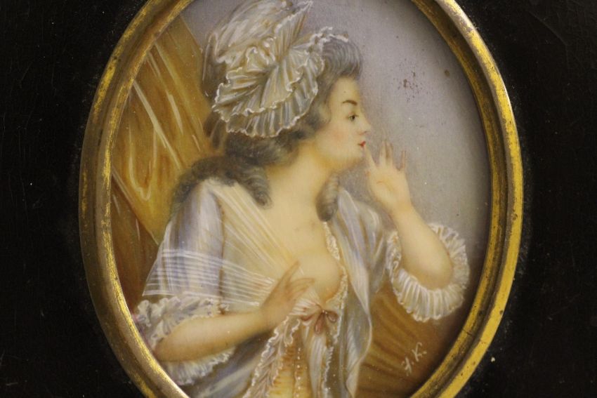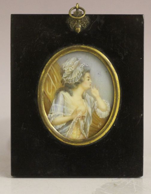 J.K (XIX-XX). French school, oval portrait miniature of a lady with left breast exposed, signed lower to middle right, framed and glazed, frame with acorn finial, 8 x 6 cm