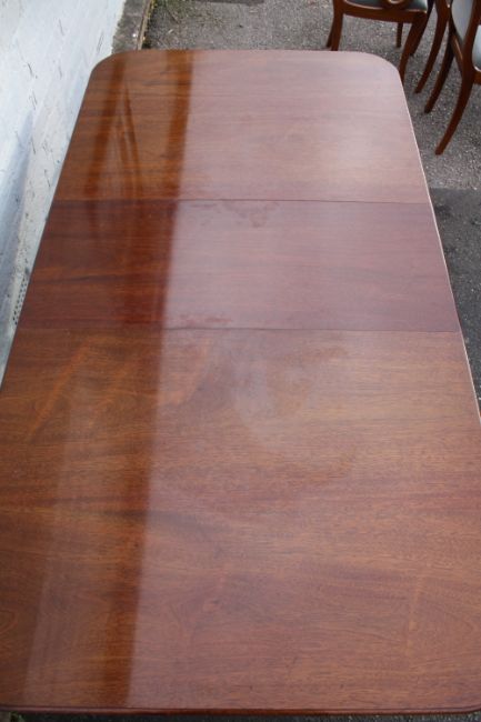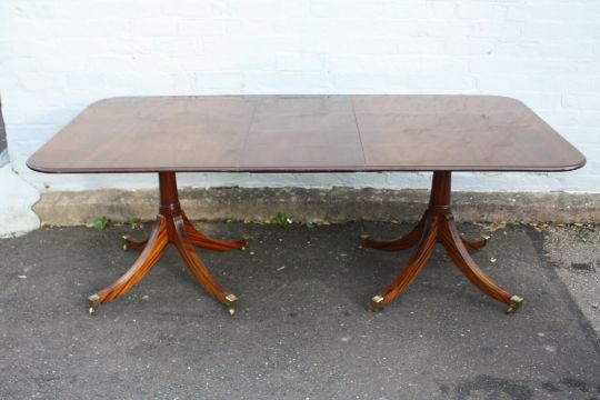A 'BRIGHTS OF NETTLEBED' REPRODUCTION MAHOGANY TWIN PEDESTAL DINING TABLE WITH ONE ADDITIONAL LEAF WITH FOUR DINING CHAIRS, the chairs with rope twist detail, table H 73 cm, W108 cm, L 160 cm - Extended L 204 cm