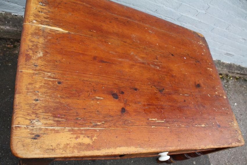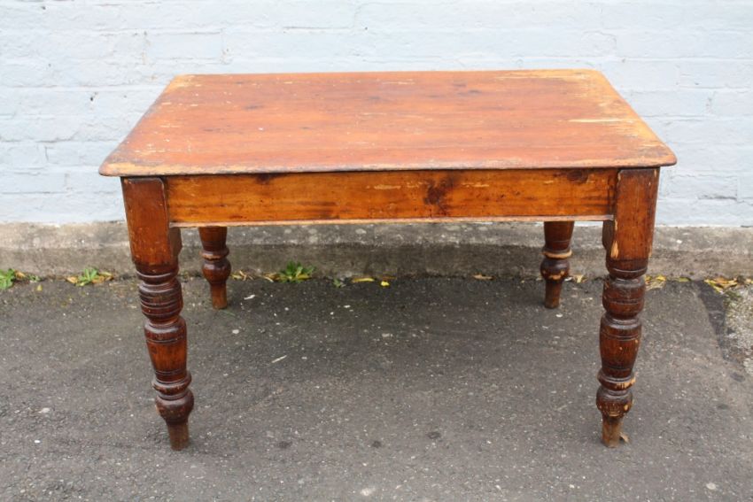 A VICTORIAN PINE SCRUB TOP KITCHEN TABLE, with single frieze drawer, raised on turned supports, H 72 cm, W 83 cm, L 122 cm