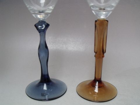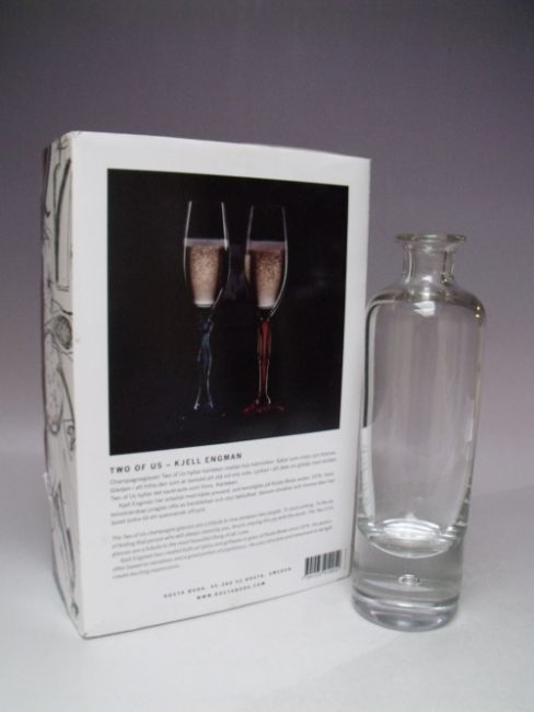 A BOXED SET OF KOSTA BODA CHAMPAGNE GLASSES 'TWO OF US' DESIGNED BY KJELL ENGMAN, together with a clear glass decanter, minus stopper, signed Kosta to base