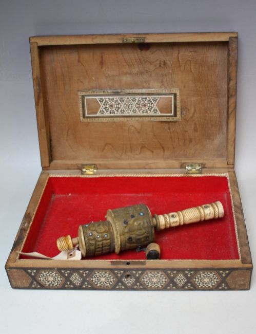 AN EASTERN INLAID RECTANGULAR BOX, W 29.5 cm, together with an Eastern prayer bell (2)