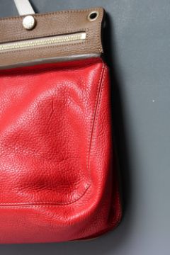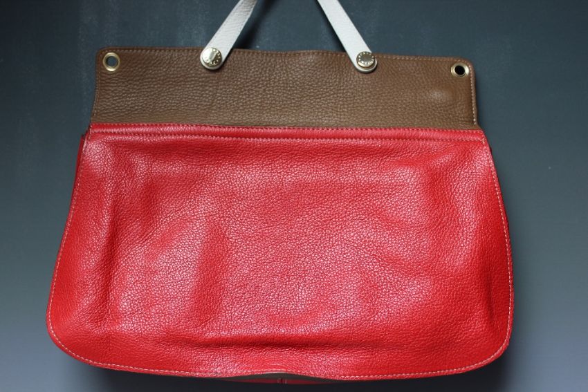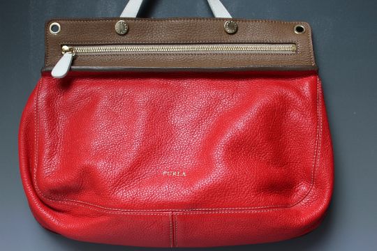 A FURLA SATCHEL STYLE HANDBAG WITH ADDITIONAL SHOULDER STRAP, red leather with cream and brown detailing, zip fastening, dust bag, H 26 cm, W 36 cm