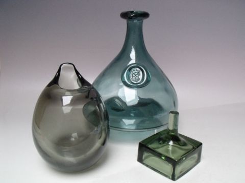 A HOLMEGAARD 'CHERRY ELSINORE' GLASS CARAFE, designed by Ole Winther, H 23.5 cm, together with a Holmegaard smoke glass vase and a Broste glass spike candle holder (3)