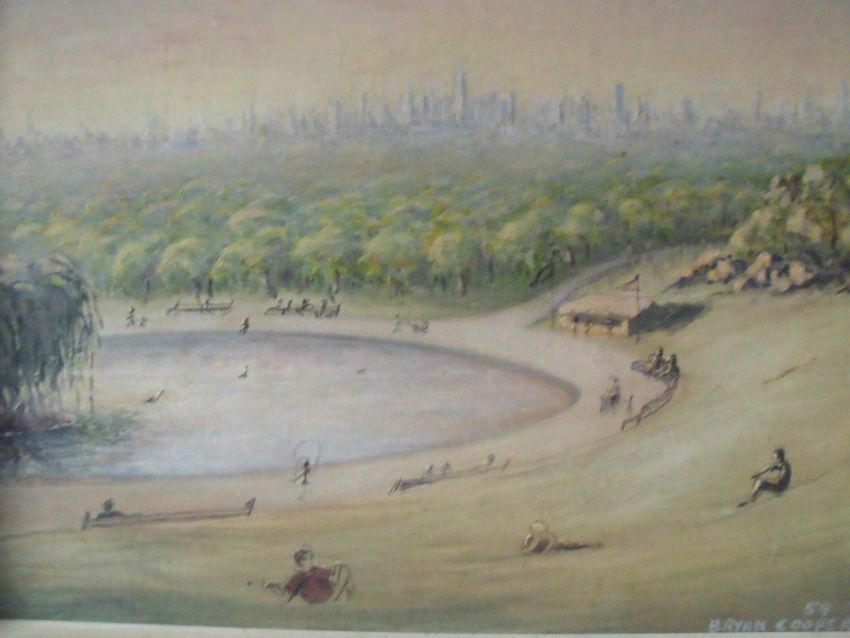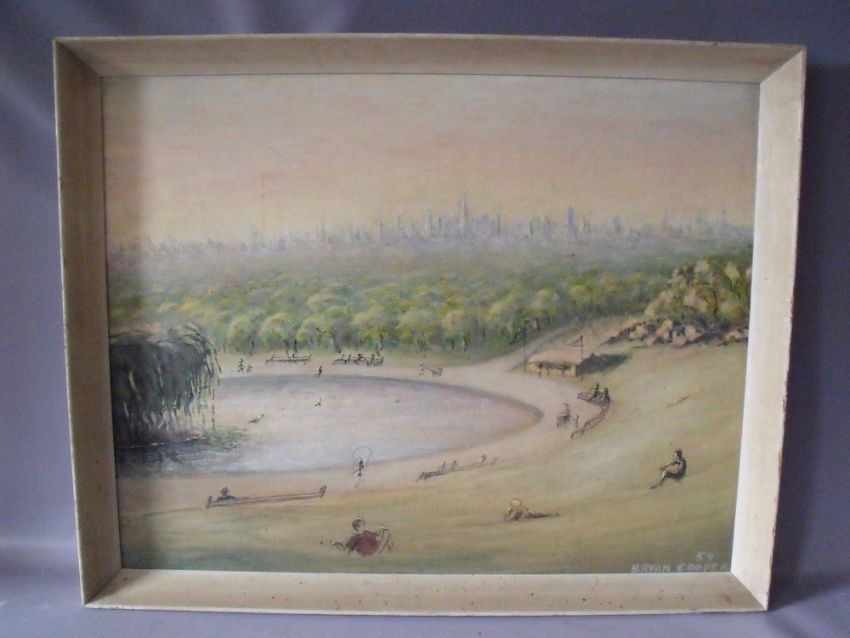 BRYAN COOPER (XX). New York skyline viewed from central Park, with numerous figures, signed and dated 1959 lower right, oil on canvas board, framed, 54 x 69 cm