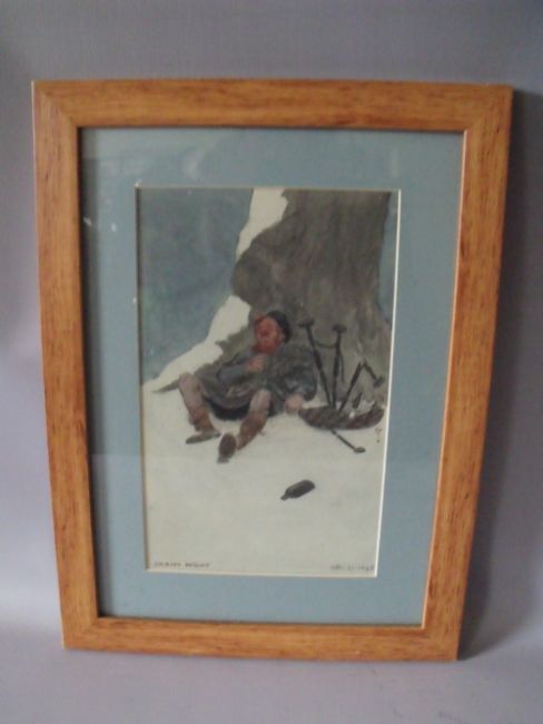 STUDY OF A DRUNKEN SCOTSMAN WITH BAGPIPES 'SILENT NIGHT', signed with monogram middle right and dated 1948 lower right, watercolour, framed and glazed, 29 x 17 cm