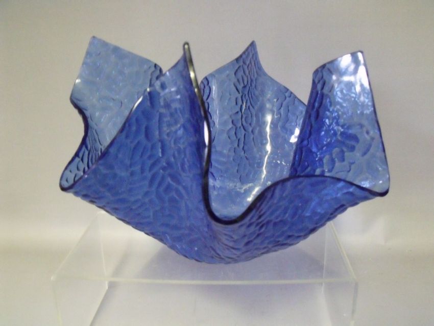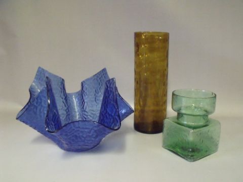 A 1960s TEXTURED BLUE GLASS HANDKERCHIEF VASE BY CHANCE BROTHERS, a larger Artic example from the 'Tinted' range introduced in 1969, together with a Swedish amber glass cylinder vase, having similar hammered finish to interior, label to base and a smaller green textured glass vase, tallest H 24.5 cm (3)
