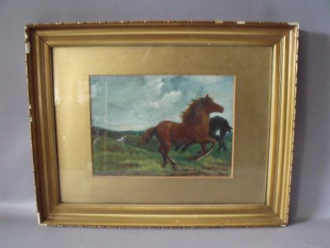 (XIX-XX). Stormy moorland scene with horses. signed lower left, oil on board, framed and glazed, 18 x 26 cm