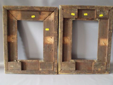 A PAIR OF LATE 18TH / EARLY 19TH CENTURY DECORATIVE GOLD FRAMES A/F, decorated with various animals to include monkeys, lizards, stags & hounds etc., frame W 10 cm, frame rebates 32 x 23 cm (2)