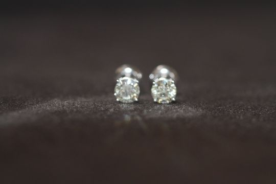 A PAIR OF 18ct WHITE GOLD SCREW BACK SOLITAIRE DIAMOND STUDS, boxed. Diamonds 1.14ct approx