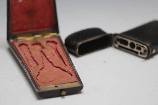 A ROSEWOOD ETUI CASE, together with a leather covered example, H 11 cm
