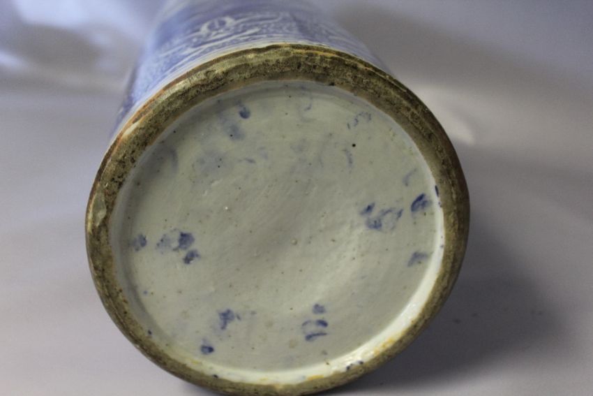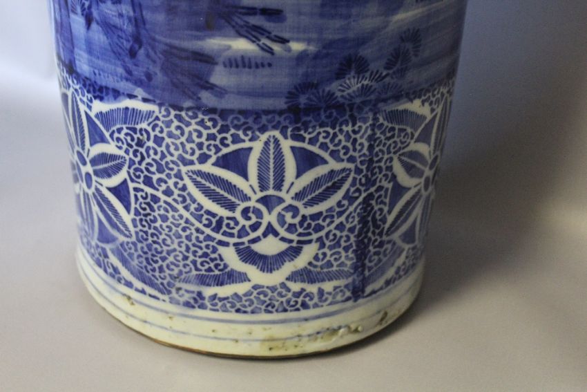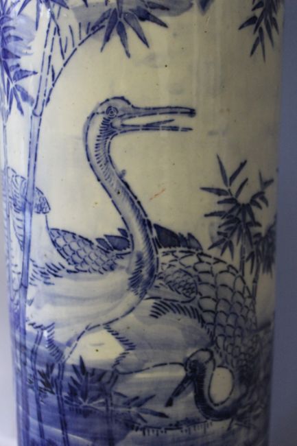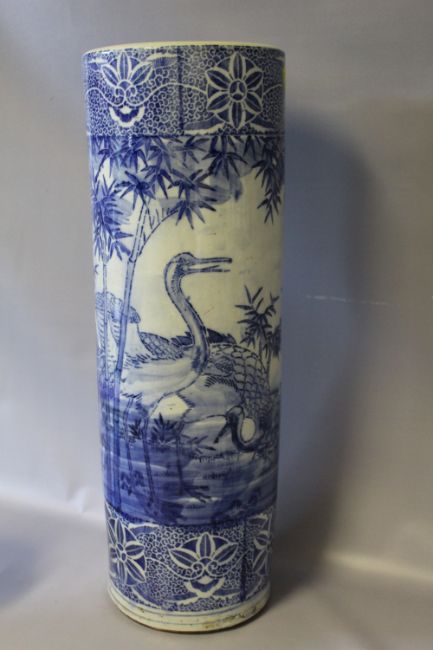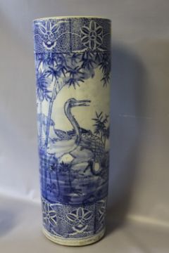 A LARGE 19TH CENTURY CHINESE BLUE AND WHITE STICKSTAND, decorated with storks in a typical Oriental landscape with bamboo, H 62 cm