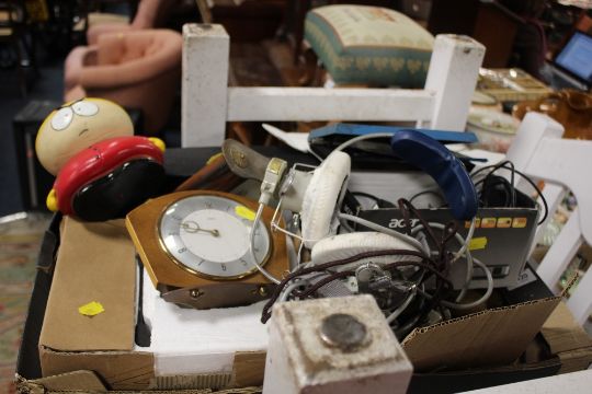 A TRAY OF ASSORTED COLLECTABLES TO INCLUDE JUGGLING BATONS, ASSORTED FANTASY CHESS PIECES, CLOCKS, AVIATION HEADPHONES ETC.