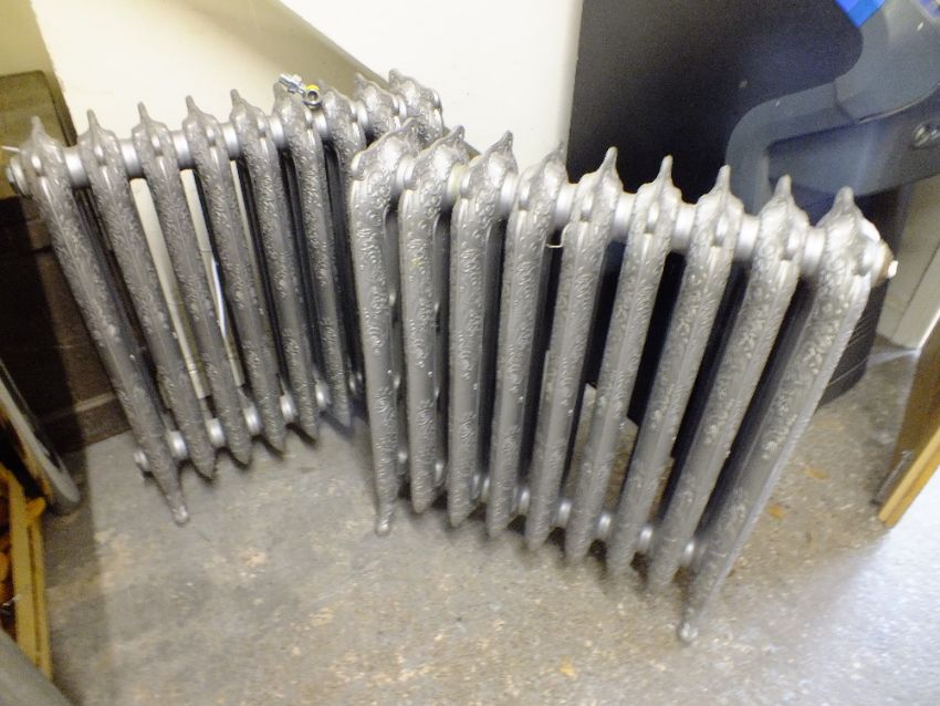 TWO CAST DECORATIVE RADIATORS - IN SILVER WITH ACANTHUS MOULDED DETAIL ALL OVER H- 77 CM W-73 CM (LONGEST)