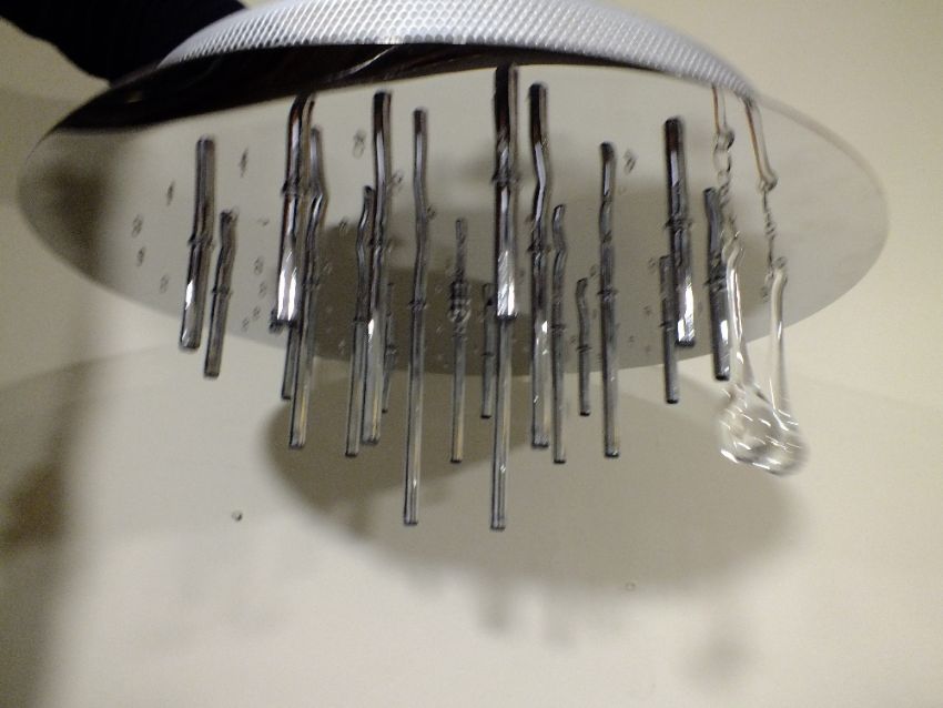 A BOXED MODERN 'SHOWER' TYPE LIGHT FITTING WITH NUMEROUS CRYSTAL DROPS - image shows 2 as fitted