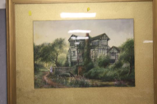 A LARGE GILT FRAMED AND GLAZED WATERCOLOUR OF A TUDOR COUNTRY HOUSE BY A RIVER SIGNED JOHN THORLEY LOWER LEFT