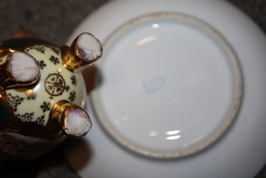A CONTINENTAL STYLE FIGURATIVE CUP AND SAUCER WITH COVER