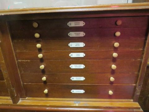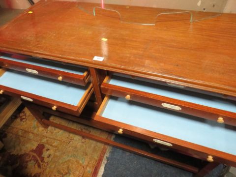 A MID CENTURY MAHOGANY CANTEEN CUTLERY CABINET ON STAND NO DOORS - AND EMPTY H-85 W-122 CM A/F