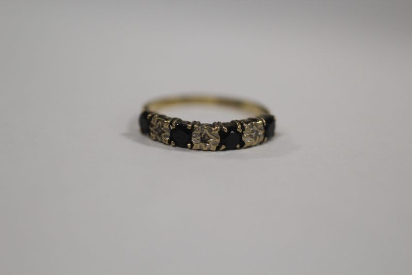 A HALLMARKED 9 CARAT GOLD ILLUSION SET DIAMOND AND SAPPHIRE RING