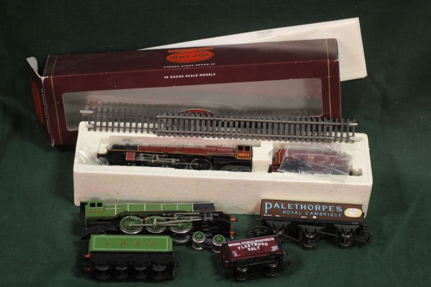 A BOX OF HORNBY MODEL RAILWAY LOCOMOTIVES AND CARRIAGES TO INCLUDE 4427 FLYING SCOTSMAN AND 6211 QUEEN MAUD LOCOMOTIVES