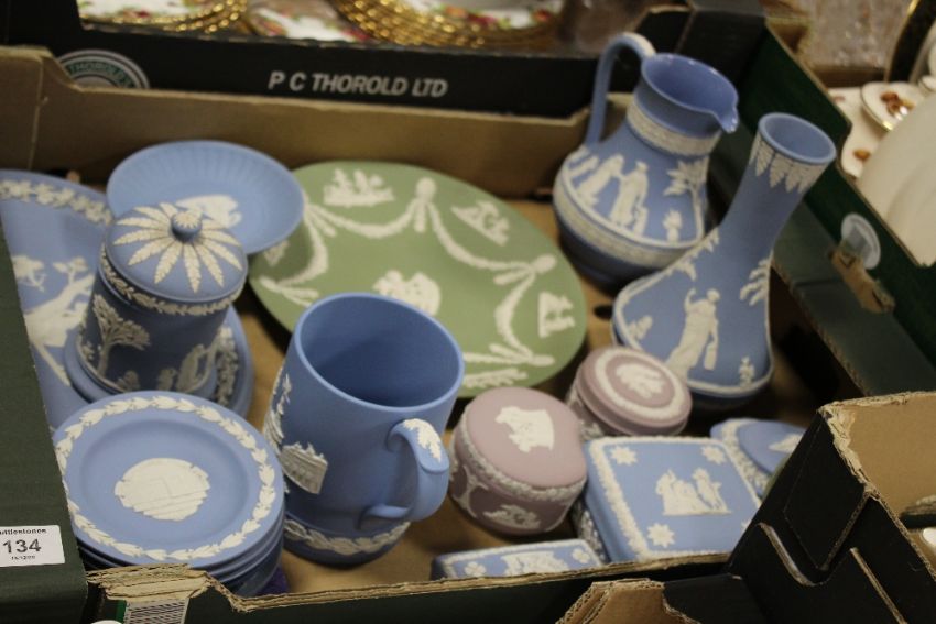 A TRAY OF ASSORTED WEDGWOOD JASPERWARE TO INCLUDE LILAC TRINKET POTS, GREEN CABINET PLATE, JUG ETC.