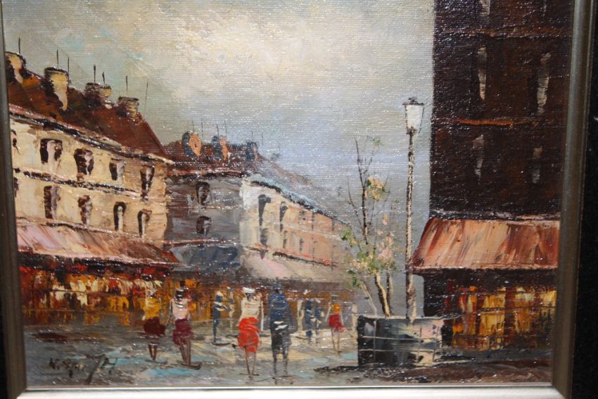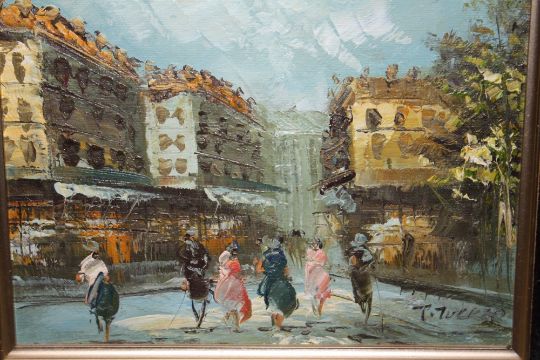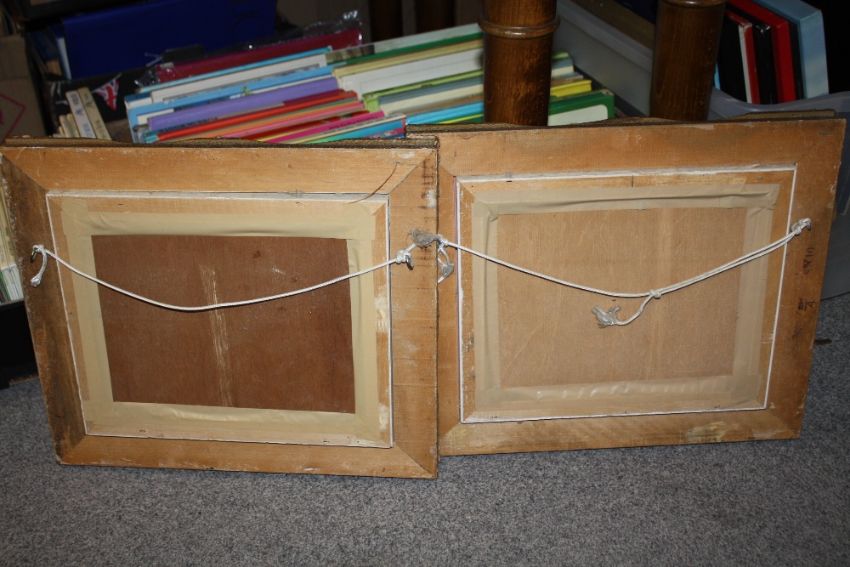 A PAIR OF GILT FRAMED OILS ON BOARD DEPICTING STREET SCENES