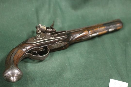 A 19TH CONTINENTAL FLINTLOCK PISTOL, possible Spanish / Portuguese, with inlaid white metal embellishments, L 33 cm