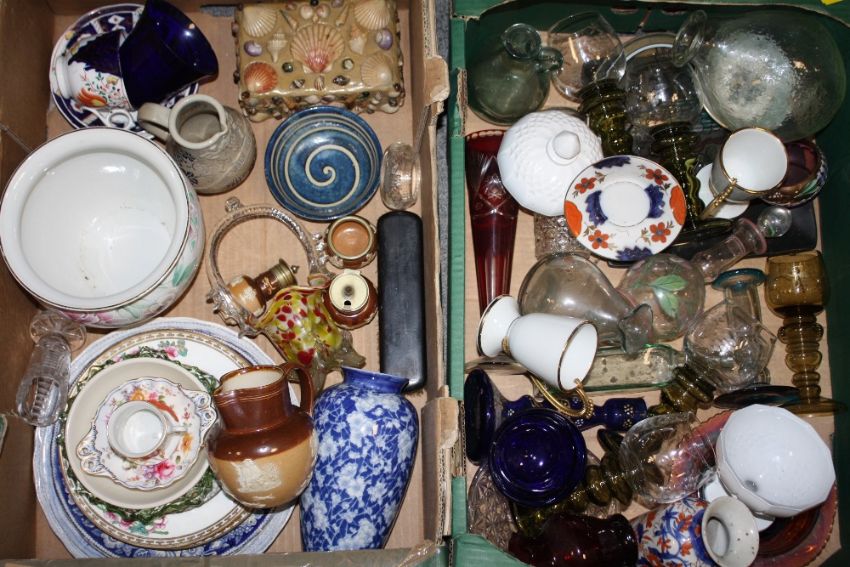 TWO TRAYS OF CERAMICS AND GLASS TO INCLUDE A ROYAL DOULTON STONEWARE JUG, ROYAL CROWN DERBY POSIES DISH ETC.