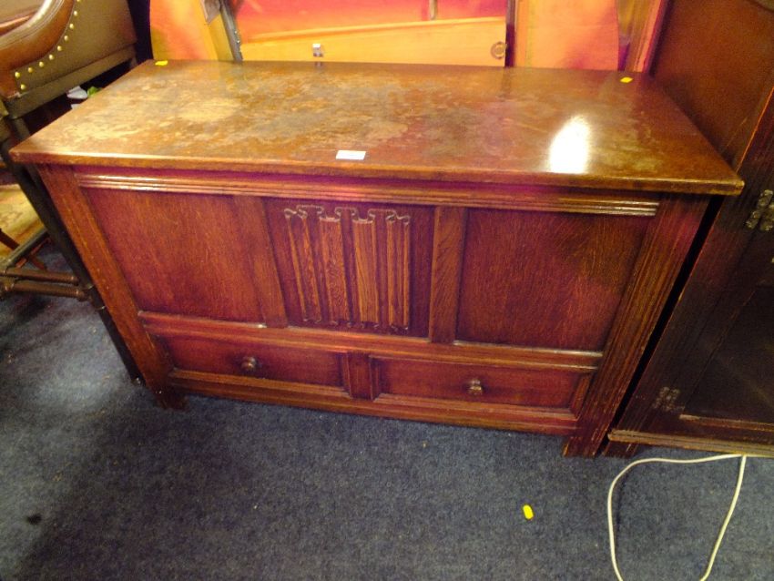 AN OAK LINENFOLD BLANKET BOX WITH DRAWERS W-104 CM