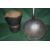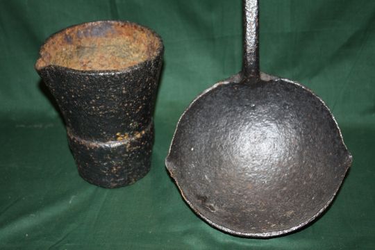 A LARGE CAST IRON LADLE, L 108 cm, together with a cast iron smelting pot, H 21 cm (2)