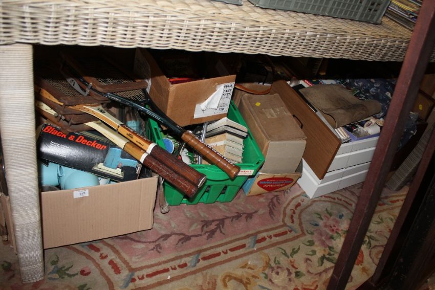 A LARGE QUANTITY OF HOUSEHOLD SUNDRIES TO INCLUDE BOARD GAMES, BOOKS, METALWARE ETC.