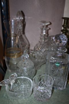 A BOX OF CUT GLASS TO INCLUDE AN EDINBURGH CRYSTAL DECANTER
