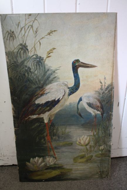 A VICTORIAN UNFRAMED OIL ON CANVAS LAID ON BOARD OF STORKS