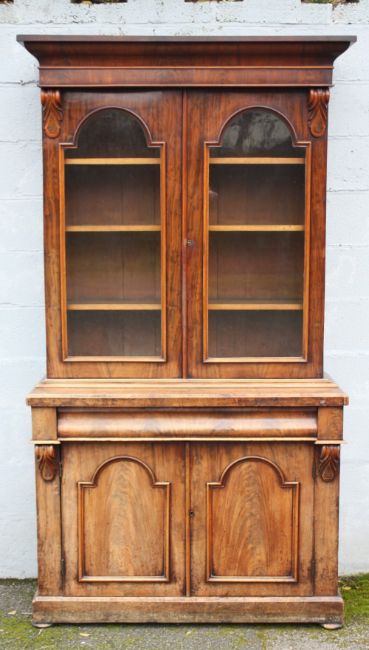 A VICTORIAN MAHOGANY GLAZED FLOORSTANDING BOOKCASE, the twin glazed door upper section with adjustable wooden shelves, the lower section with a single frieze drawer and panelled twin door cupboard below, H 225 cm, W 125 cm, D 52 cm