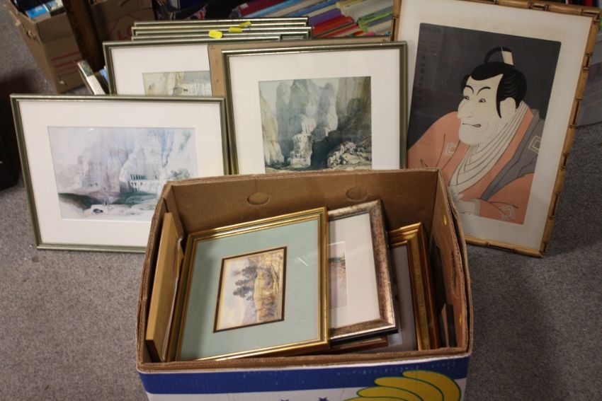A BOX OF PICTURES AND PRINTS TO INCLUDE WATERCOLOURS, TOGETHER WITH A JAPANESE STYLE WARRIOR PRINT AND A SET OF EIGHT PRINTS OF PETRA (QTY)