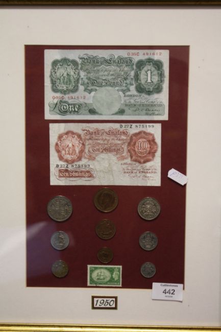 A FRAMED AND GLAZED 1950 COIN AND NOTE DISPLAY