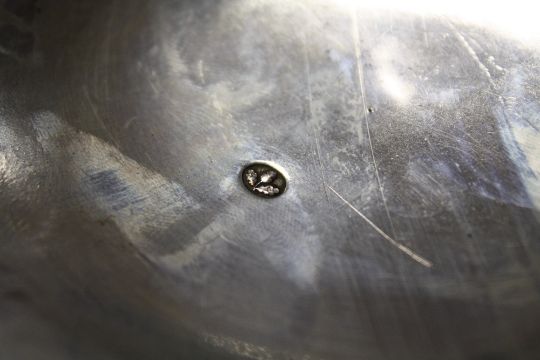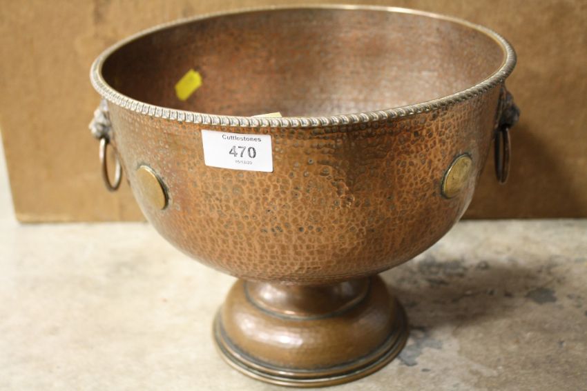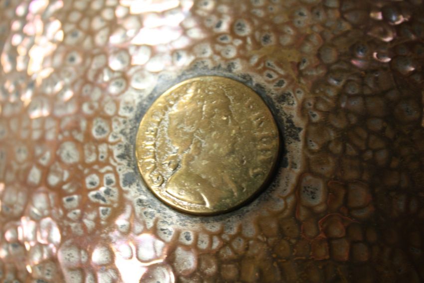 AN UNUSUAL HAMMERED FINISH COPPER TWIN HANDLED FOOTED BOWL WITH GEORGIAN COINS TO OUTER EDGE, STAMPED TO BASE WITH AN ACORN