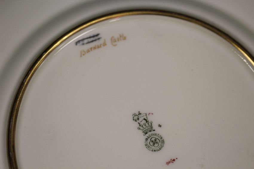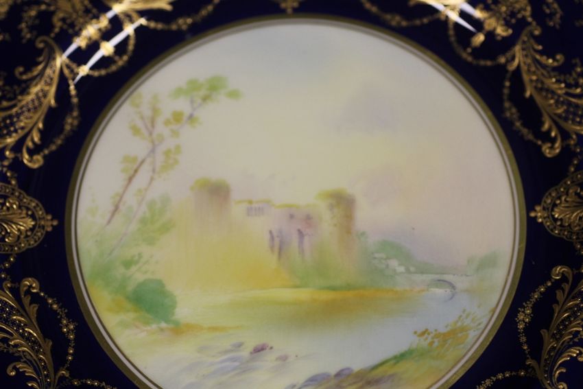 A HIGHLY JEWELLED ROYAL DOULTON CABINET PLATE - BARNARD CASTLE, Dia 27 cm, together with a damaged Royal Worcester plate, signed lower right Davis (2)