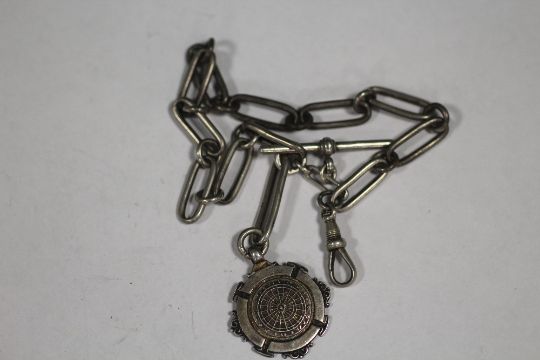 AN ANTIQUE SILVER FANCY LINK POCKET WATCH CHAIN WITH FOB