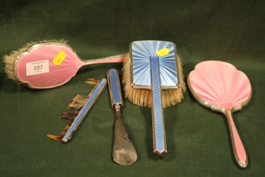 A HALLMARKED SILVER AND BLUE GUILLOCHE ENAMEL BRUSH COMB AND SHOEHORN, TOGETHER WITH A HALLMARKED SILVER ND PINK ENAMEL BRUSH AND MIRROR (5)