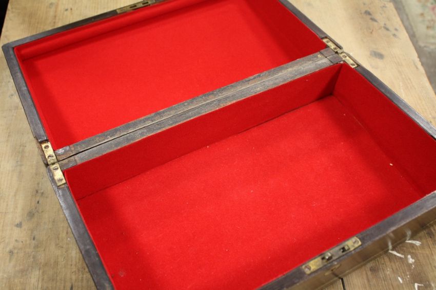 A MOTHER OF PEARL INLAID LIDDED BOX WITH BAIZE LINED INTERIOR