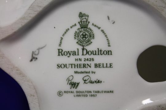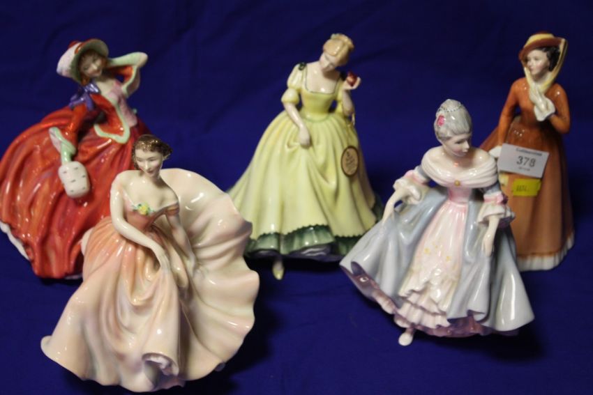 A COLLECTION OF FIVE ROYAL DOULTON LADY FIGURES 'AUTUMN BREEZES' HN1934, 'THE POLKA' HN2156, 'JULIA' HN2705, 'SOUTHERN BELLE' HN2425 AND 'PAULA' HN2906