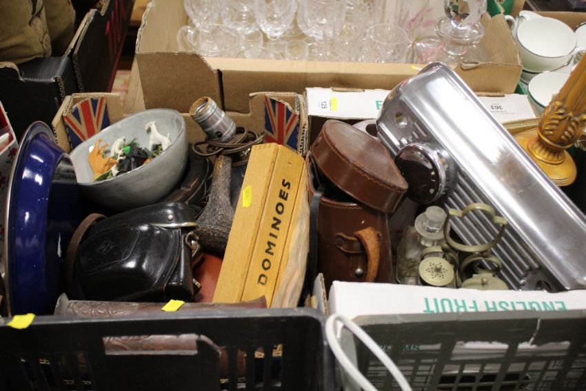 TWO TRAYS OF COLLECTABLES TO INCLUDE BINOCULARS, CAMERA, GILT PEDESTAL ETC