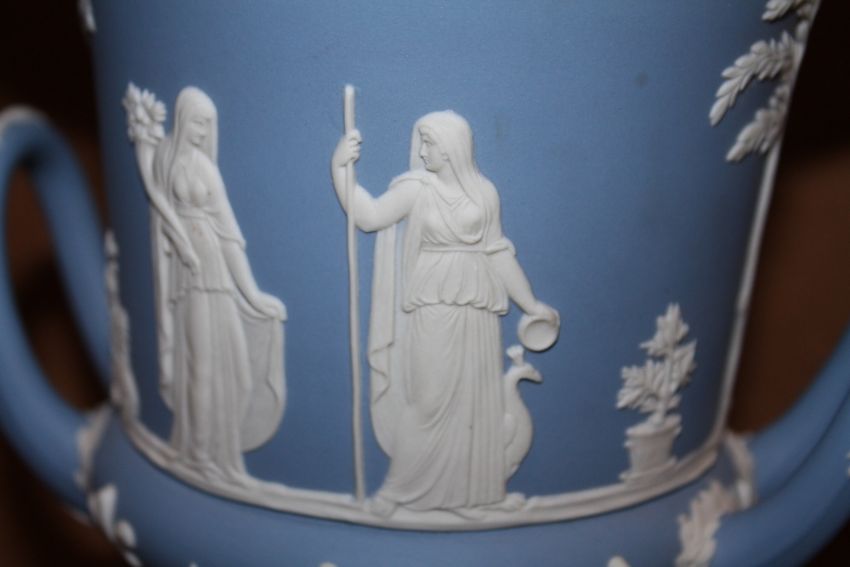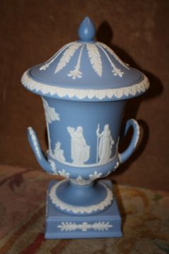 A WEDGWOOD BLUE JASPERWARE TWIN HANDLED CAMPANA LIDDED URN