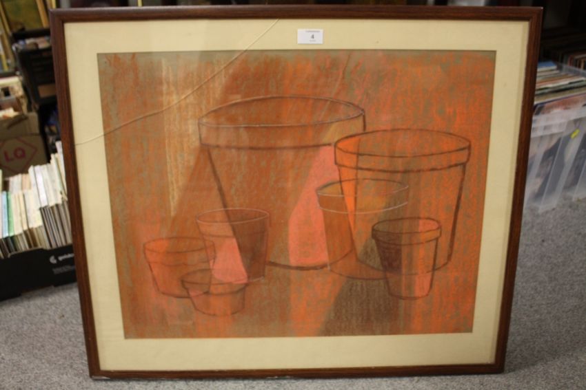 A FRAMED ABSTRACT PASTEL OF PLANT POTS